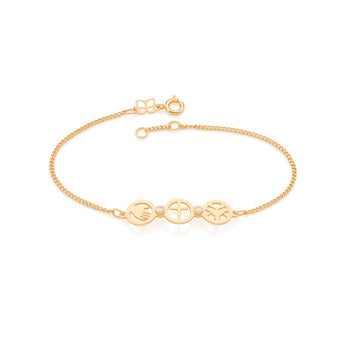 Rommanels celebrate collection was inspired by gratitude a feeling that always surrounds us during celebrations. this collection features delicate and timeless pieces that showcase our stunning colored zirconias. enjoy the thrill of giving and being gifted with this collection. gold plated bracelet composed of a 0.4mm curb chain measuring 19cm – can be adjusted to 18cm – featuring a pendant at the center with the holy trinity with two (2) white zirconias measuring 2mm each. add a delicate touch of faith to your everyday look with this beautiful bracelet. | size: 19cm - can be adjusted to 18cm.â | metal: 18k gold plated.