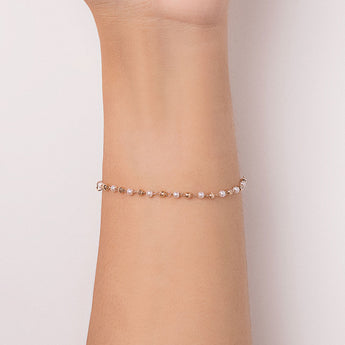 This charming bracelet offers a sophisticated blend of classic and modern textures. It features a delicate chain beautifully accented with luminous 3 synthetic pearls and intricate textured spheres.
