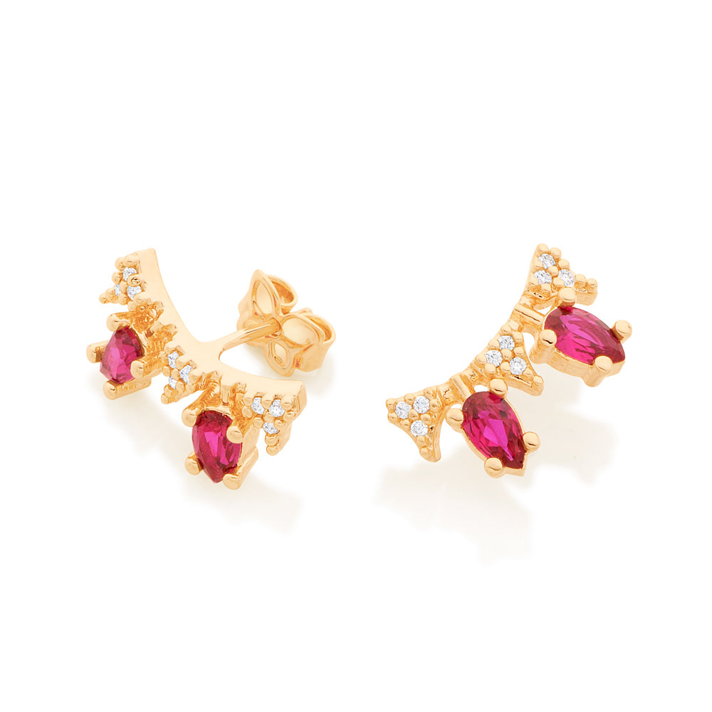 Rommanelss joy for life by ana hickmann collection was inspired by the happy moments in ana hickmann’s life. the pieces in the cherry line go unnoticed – the combination of pink and red tones result in this stunning cherry color, a super unique trend. gold plated ear jacket composed of three (3) triangles studded with six (6) white zirconias each measuring 1mm each and two (2) cherry zirconias measuring 3x5mm which alternate between the triangles. entire earring measures a1.5 x 0.7cm. our cherry line is a must have in any jewelry collection. also available in black rhodium. (licensed jewelry collection ana hickmann 20th edition)"
