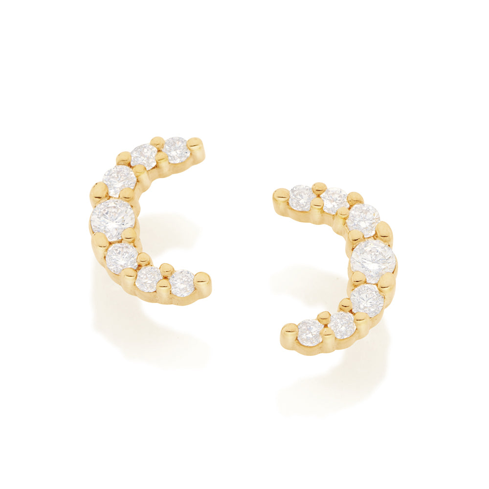 Rommanels dream collection by giovanna antonelli has as its main inspiration the world of dreams. the small delights line focuses on smaller and more delicate jewelry that include cubic zirconias and sparkles, as well as moon and star shapes. this line was developed to create compositions, mix-n-match, and to be mixed with jewelry from past collections. gold plated stud earring in the shape of a waning crescent moon studded with four (4) white zirconias measuring 1.25mm, two (2) white zirconias measuring 1.5mm, and one (1) white zirconia measuring 2mm. entire earring measures 0.8 x 0.3 cm. if you love wearing matching sets, pair it with our matching pendant and ring to create a stunning set. | size: 0.8cm x 0.3cm. | material: 18k gold plated. | also available in rhodium. (licensed jewelry collection giovanna antonelli 12th edition)"