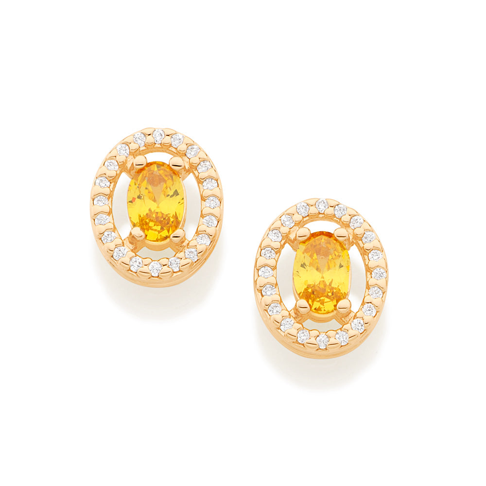 Rommanels joy for life by Ana hickmann collection was inspired by the happy moments in Ana hickmann life. these pieces were inspired by family and our teddy bear line showcases the delicacy and care of a Mothers day touch. gold plated stud earring composed of one (1) yellow oval zirconia measuring 4x6mm at the center surrounded by twenty (2) white zirconias measuring 1mm each. entire earring measures 1.1 x 0.9cm. if you love a matching set, pair it with our gold plated halo ring to complete the look. | material: 18k gold plated. | also available with blue zirconia. (licensed jewelry collection Ana hickmann 20th edition)"
