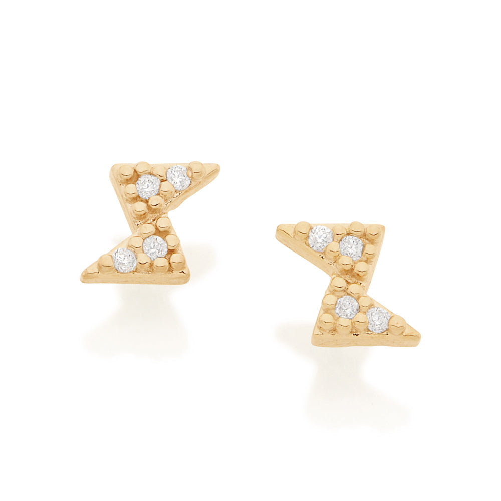 Rommanels dream collection by giovanna antonelli has as its main inspiration the world of dreams. the small delights line focuses on smaller and more delicate jewelry that include cubic zirconias and sparkles, as well as moon and star shapes. this line was developed to create compositions, mix-n-match, and to be mixed with jewelry from past collections. gold plated stud earring in the shape of a lightning bolt with eight (8) white zirconias measuring 1mm each. earring measures about 0.5 x 0.4 cm. this super adorable earring is perfect for an upper lobe earring (second hole). | size: 0.5cm x 0.4cm. | material: 18k gold plated. (licensed jewelry collection giovanna antonelli 12th edition)"