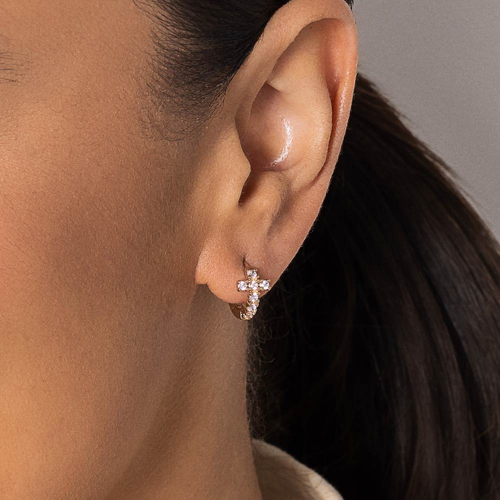 These petite and powerful huggie hoops offer a minimalist yet radiant statement. The timeless cross shape is completely "iced out," featuring fourteen dazzling white Zirconia stones for maximum brilliance. Designed to hug the earlobe, these earrings provide continuous sparkle and religious symbolism in an elegant, wearable size.