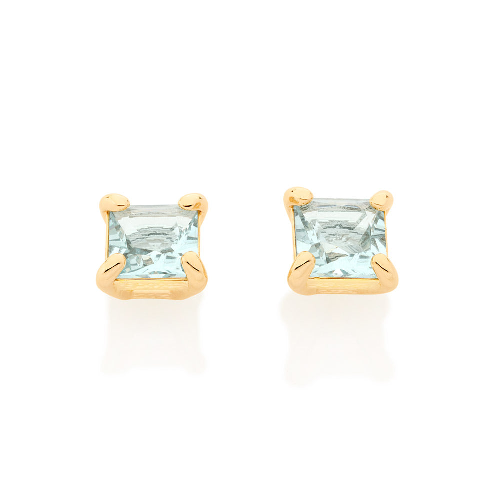 Gold plated square stud earring composed of 1 light blue square zirconia measuring 6mm. size: 0.7cm x 0.7cm (0.28in x 0.28in).