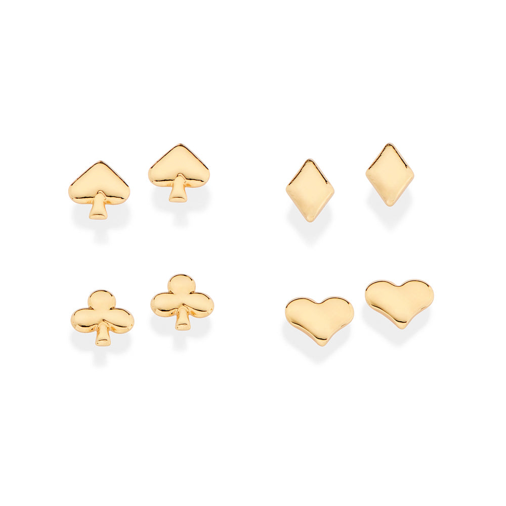 18k gold-plated stud earrings kit composed of four (4) earrings with the suits of a deck of cards. size: 0.5cm x 0.6cm/ 0.6cm x 0.5cm/ 0.6cm x 0.4cm /0.5cm x 0.5cm (0.19in x 0.23in/ 0.23in x 0.29in/ 0.23in x 0.15in/ 0.19in x 0.19in).