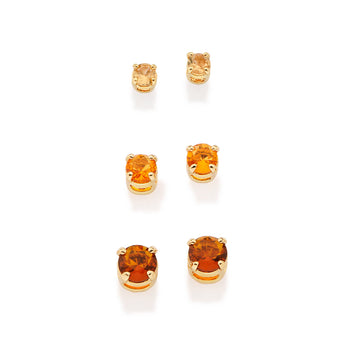 18k gold plated-plated trio earring kit composed of one (1) pair studded by two (2) crystals measuring 5mm each, one (1) pair studded by two (2) crystals measuring 4mm each, and one (1) pair studded by two (2) crystals measuring 3mm each. size: 0.5cm x 0.5cm / 0.4cm x 0.4cm / 0.3cm x 0.3cm (0.2in x 0.2in / 0.16in x 0.16in / 0.12in x 0.12in). "
