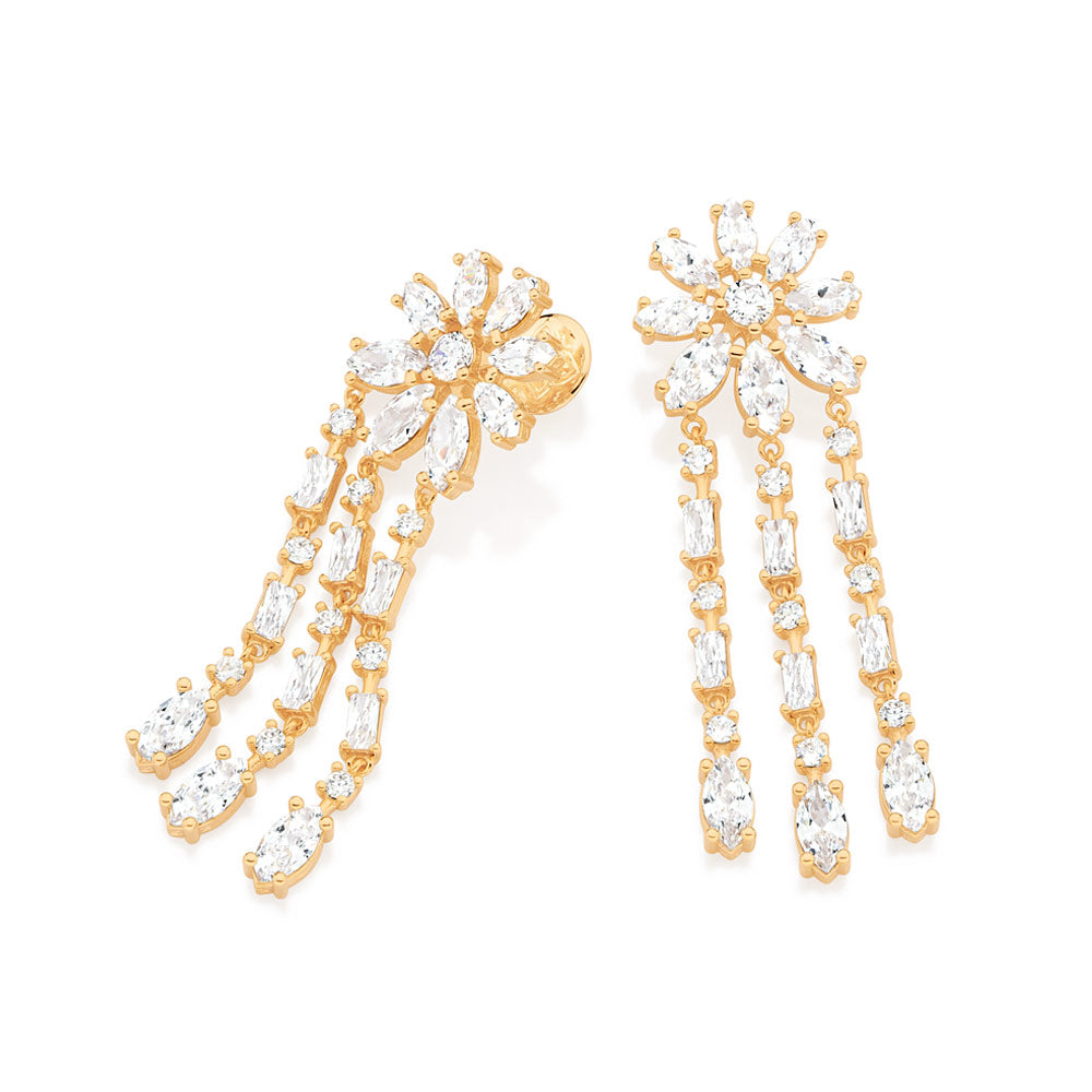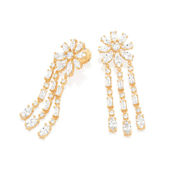 Gold plated, dangly earrings in the shape of a flower with fringe studded by 2 white zirconias measuring 5mm each, 10 white zirconias measuring 4x8mm each, 12 white zirconias measuring 5x10mm each, 18 white zirconias measuring 3mm each and 12 white zirconias measuring 3x6mm each. size: 7.2cm x 2.3cm (2.83in x 0.91in). "