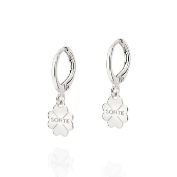 Platinum huggie earrings in the shape of a four leaf clover with the word sorte (luck) engraved at the center. size: 2cm x 0.8cm x 1.1cm in diameter.