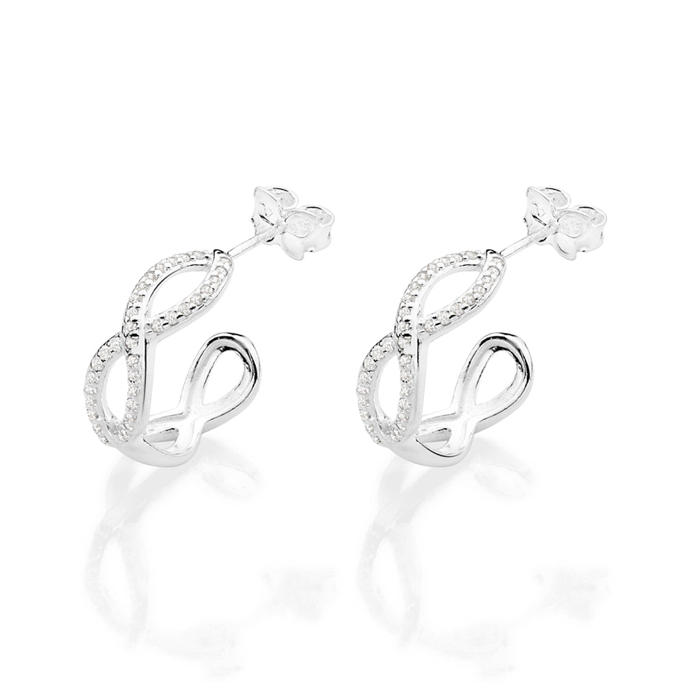 Silver 925 hoop earrings in the shape of an infinity sign studded by seventy (70) zirconias measuring 1mm each. size: 1.8cm (0.7in).