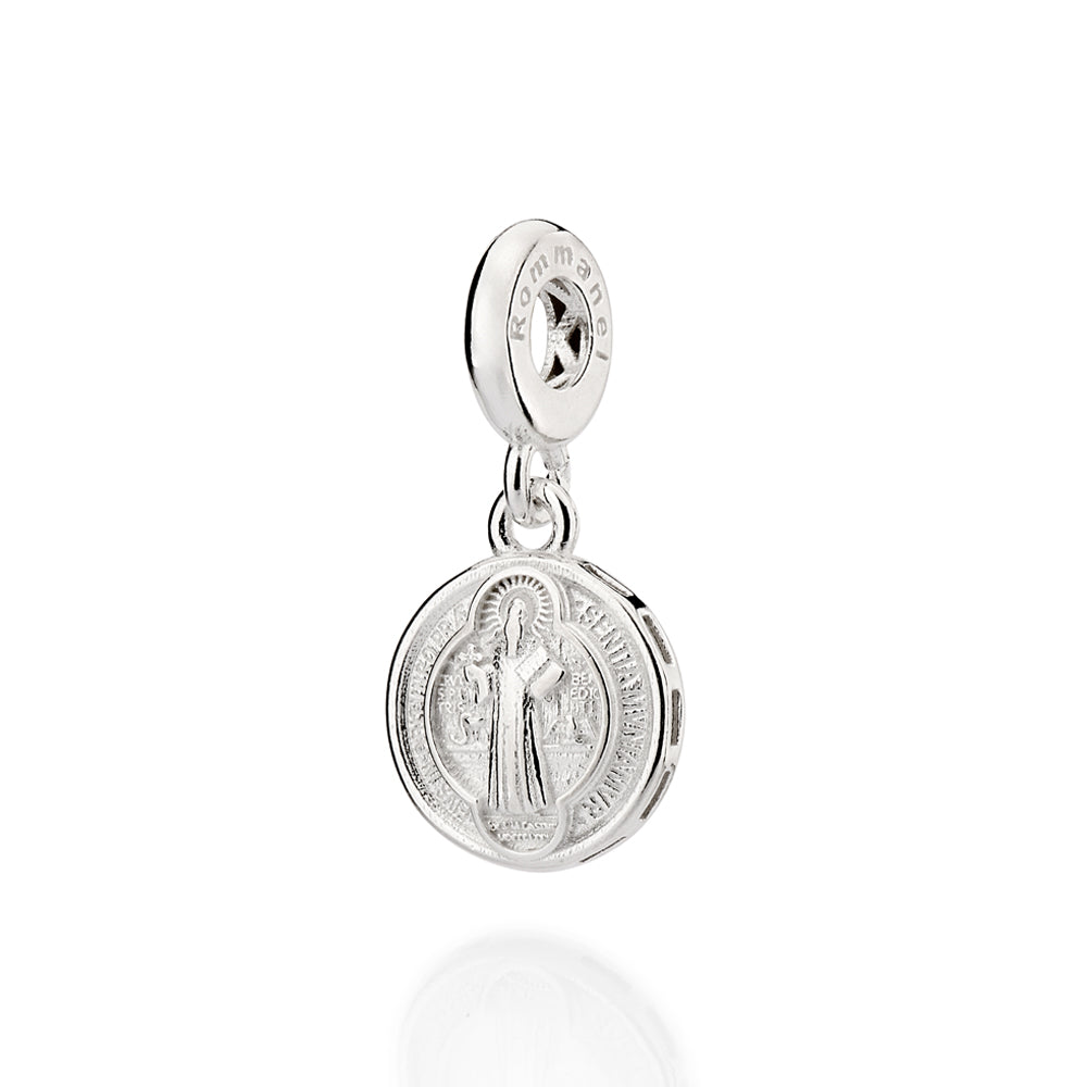 Silver 925 charm in the shape of a circle with the image of saint benedict at the center. size: 2.3cm x 1.2cm (0.91in x 0.47in).