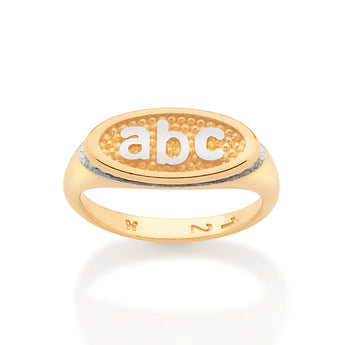 Gold plated ring with oval centerpiece featuring an abc engraving at the top and textured background with rhodium application.