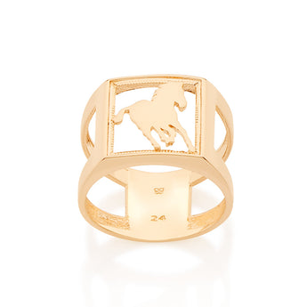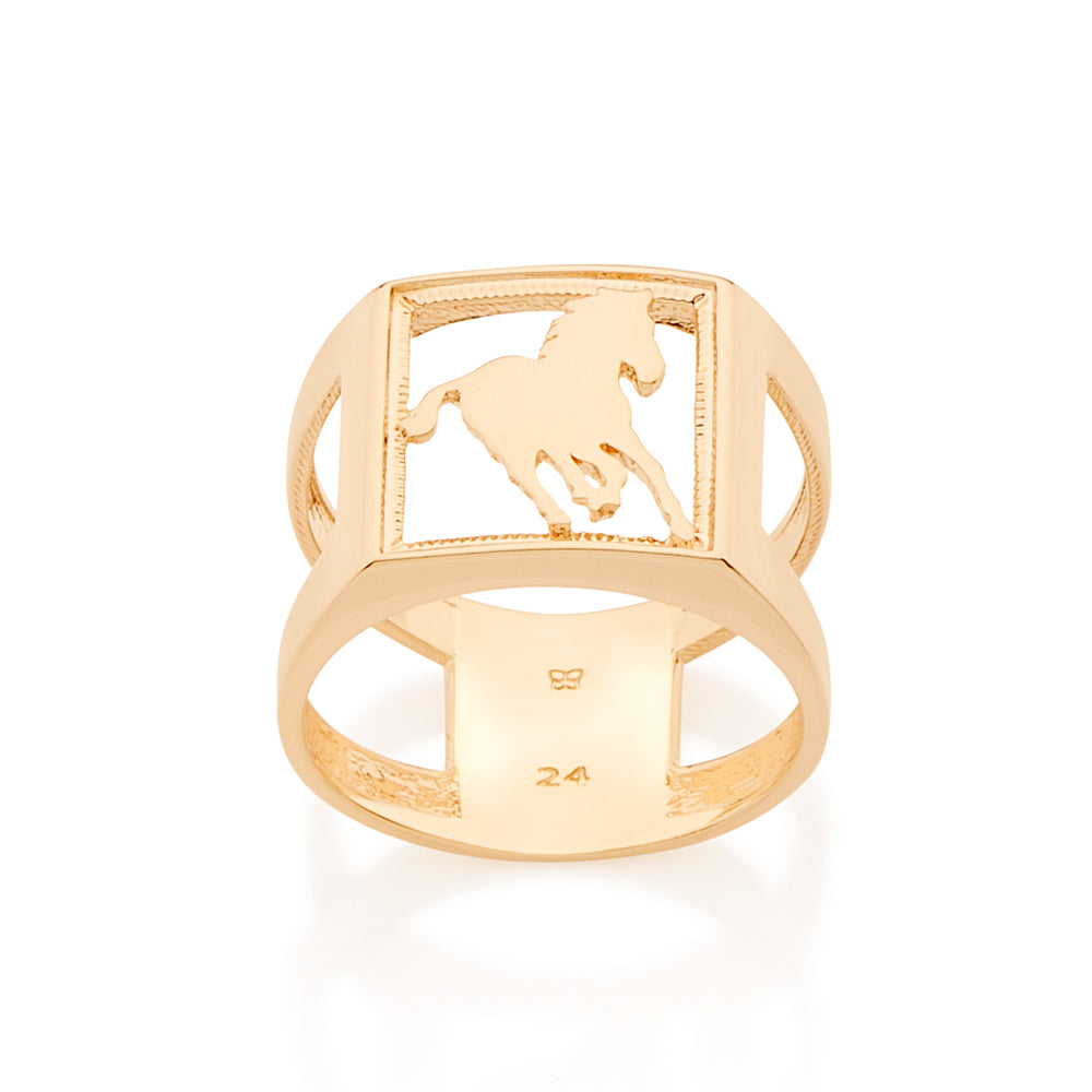 Rommanel men's 2020 collection explores jewelry that transits between classic, modern, and casual styles. they are striking pieces that enhance contemporary men's style. we also present the new men's collection signed by the designer mario queiroz. it features cross pendants for modern accessorizing, textured sets and designs inspired by high jewelry. gold plated ring composed of hollow sides and a detailed horse on the front. | material: 18k gold plated. (licensed jewelry capsule collection men 2020)"