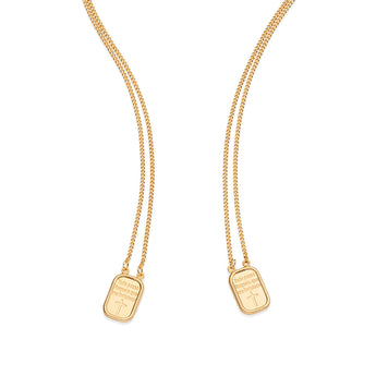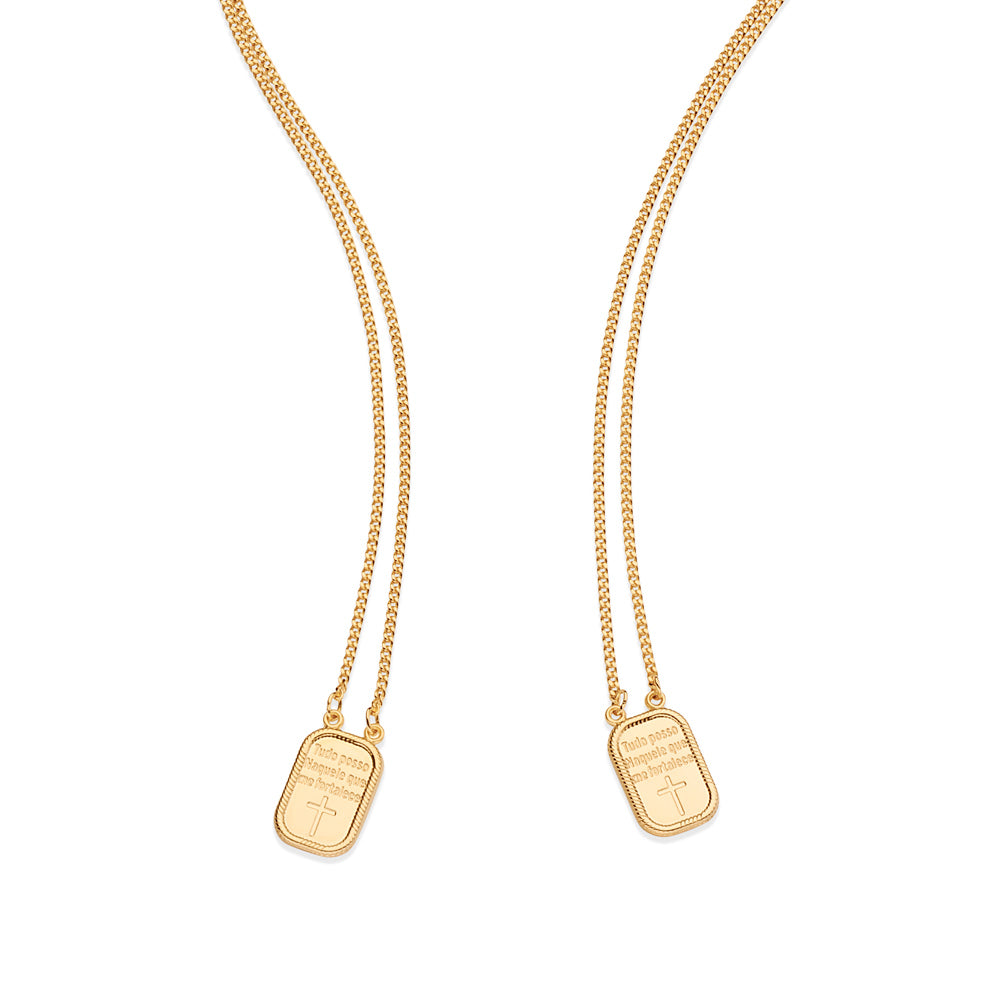 Gold plated scapular necklace composed of 2 rectangular medals on each end with philippians 4:13 engraved on it. size: 68cm (26.8in).