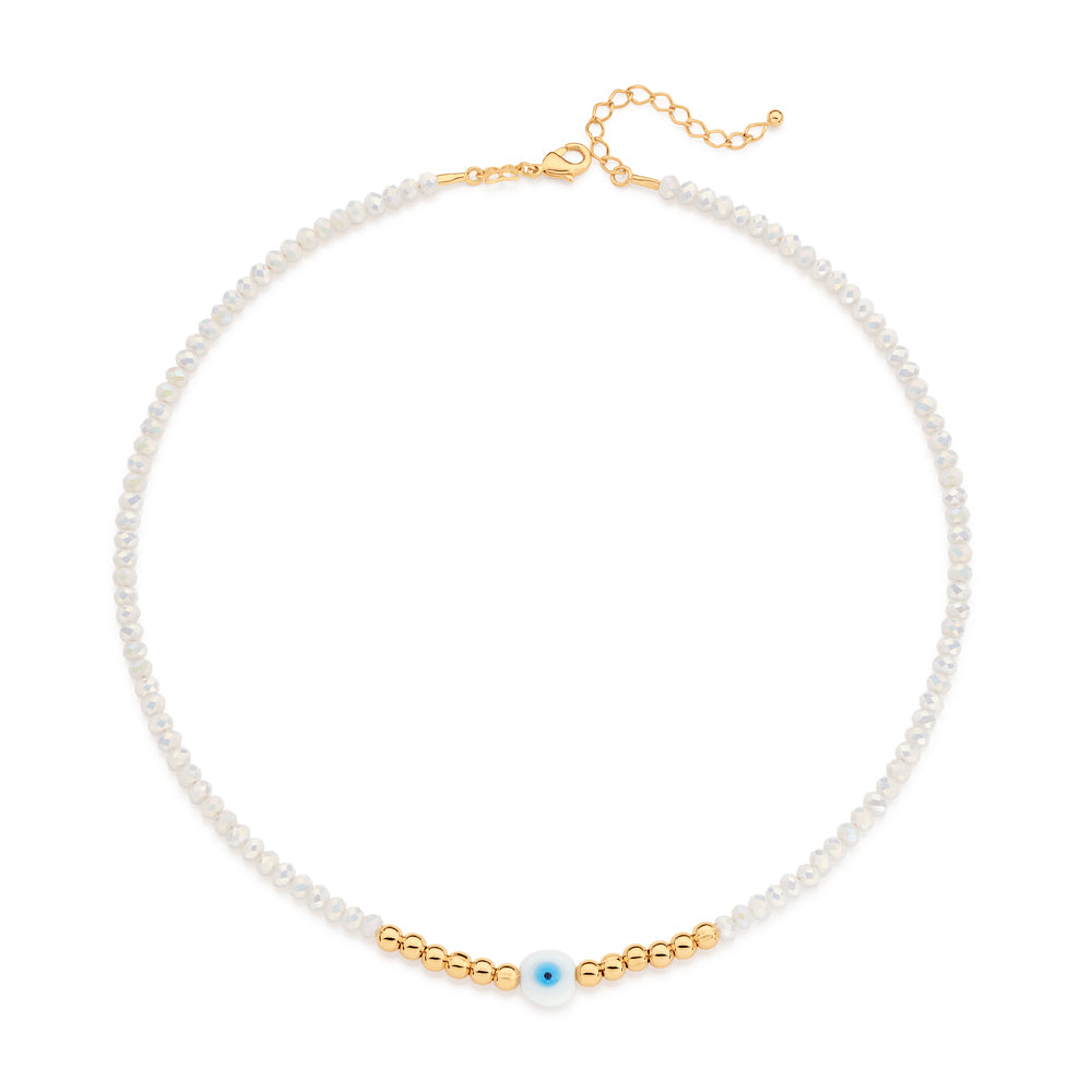 Gold plated, choker necklace composed of 104 faceted white crystals measuring 4mm each, 12 solid spheres measuring 4.5mm each, and 1 natural stone greek eye measuring 10mm at the center. size: 50cm - can be adjusted to 45cm. exclusive licensed jewelry of ""giovanna antonelli fashion jewelry"" collection "