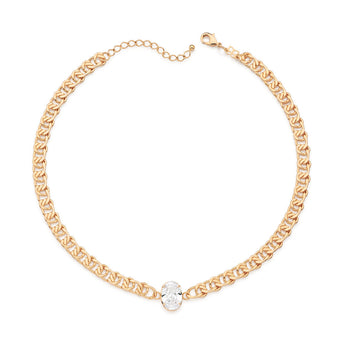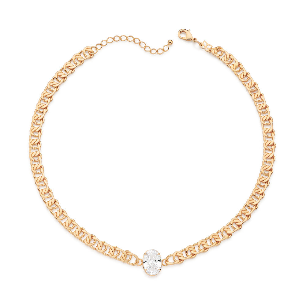 18k gold-plated choker composed of a double link chain and one (1) white oval zirconia measuring 10x19mm at the center. size: 16in - can be adjusted to 15in.