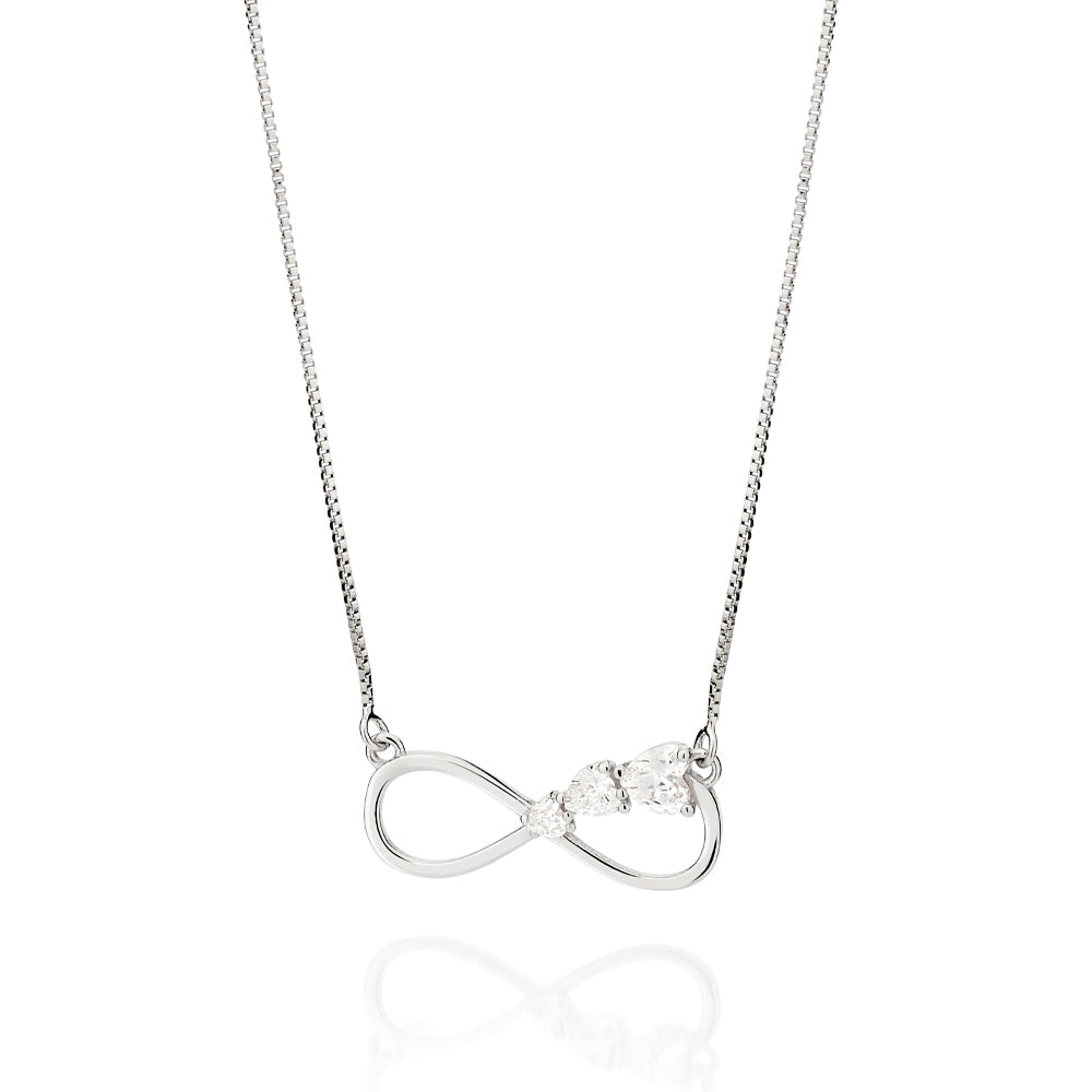 Platinum necklace composed of a cable link chain and a infinity sign pendant studded by 1 white heart zirconia measuring 5x5mm, 1 white heart zirconia measuring 4x4mm and 1 white zirconia measuring 3x3mm. size: 50cm (19.69in) - can be adjusted to 45cm (17.71in)."