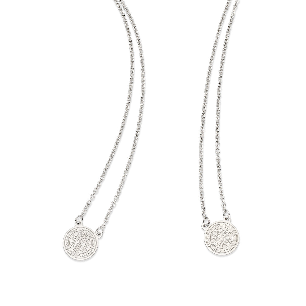 Platinum scapular necklace composed of an anchor link chain of 0.4mm with 2 circle medals on each end engraved with saint benedict.