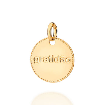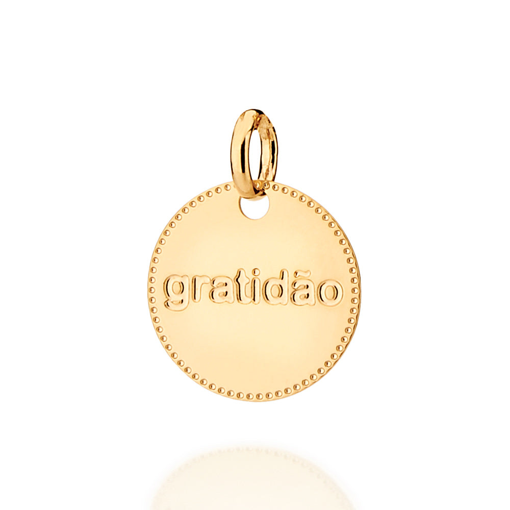 Gold plated circle pendant with a textured outline and the word gratidãƒo (gratitude) engraved at the center. size: 1.8cm x 1.4cm (0.7in x 0.6in).
