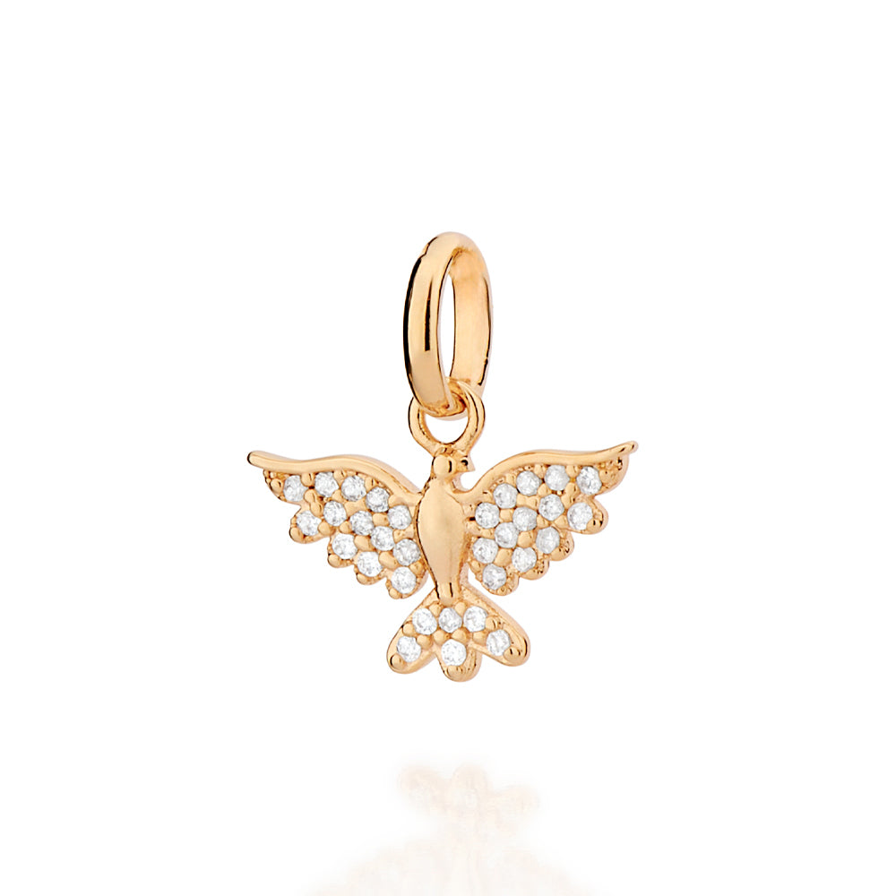 18k gold-plated pendant in the shape of the holy spirit dove studded by thirty-two (32) white zirconias measuring 1mm each. size: 1.3cm x 1.5cm (0.51in x 0.59in).