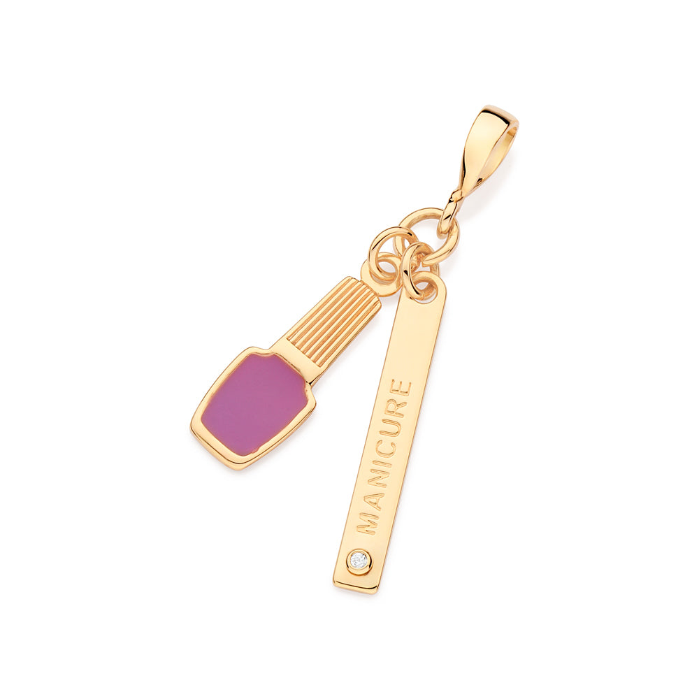 Gold plated rectangular pendant with the word “manicure” engraved into it and a nail polish bottle with resin application. size: 3.9cm x 0.6cm (1.54in x 0.24in).