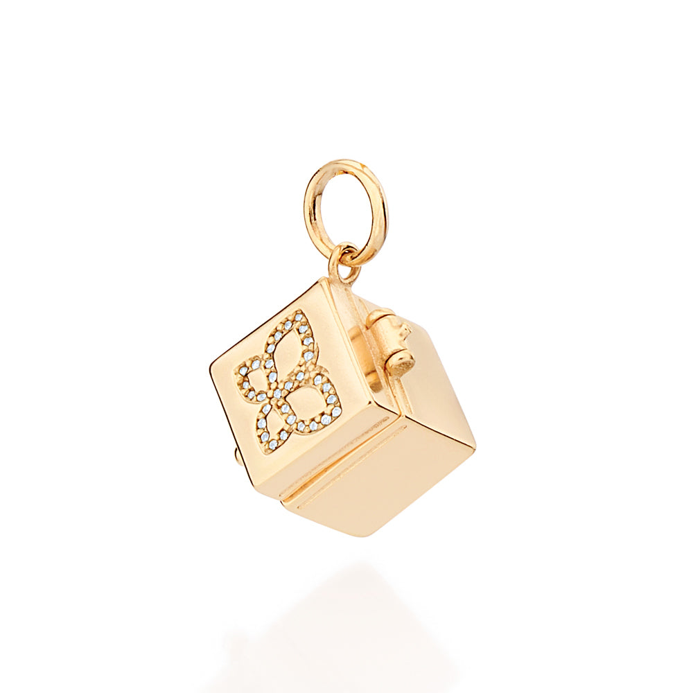 18k gold plated pendant in the shape of a music box with a ballerina on the inside studded by a mirror on the inside and thirty-one (31) white zirconias measuring 0.8mm each. size: 11.35x11.35x12.5mm (0.45in x 0.45in x 0.49in).