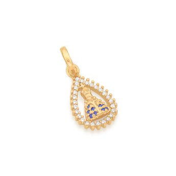 Rommanel presents the power to transform, an annual collection that reinforces your purpose and celebrates Rommanels 35th birthday. with jewelry that tells a story and translates Rommanels essence, the collection brings you pieces full of meaning. gold plated pendant of our lady of aparecida in the shape of a water droplet studded with twenty-six (26) white zirconias measuring 0.8mm each, and ten (1) blue zirconias measuring 0.8mm each. | size: 13mm x 8mm. | stone: zirconia. | material: 18k gold plated. "
