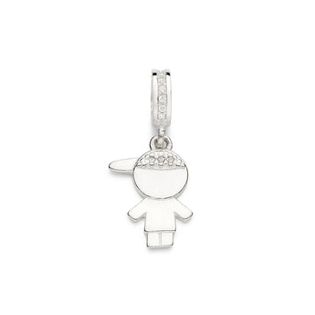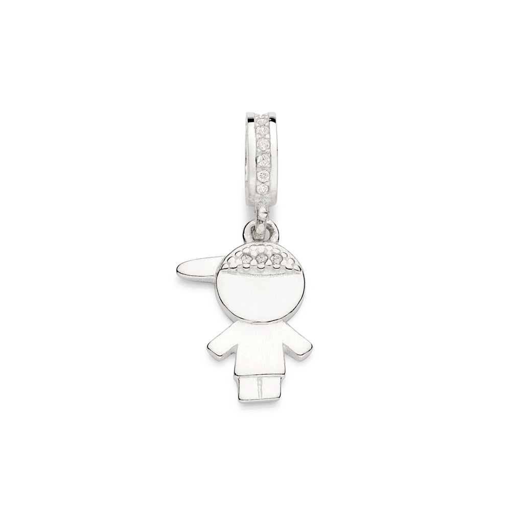 Silver 925 charm in the shape of a boy studded by thirteen (13) white zirconias measuring 1mm each on the clasp and three (3) white zirconias measuring 1mm each on the boy’s hat. size: 2.4cm x 1.1cm (0.94in x 0.43in).