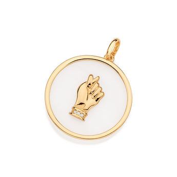 Gold plated, circle pendant composed of 1 mother of pearl measuring 27mm and an amulet studded at the center studded by 3 zirconias measuring 1mm each. size: 3.4cm x 2.6cm (1.34in x 1.02in). exclusive licensed jewelry of ""giovanna antonelli fashion jewelry"" collection "