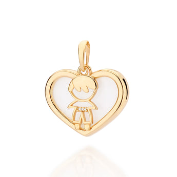 18k gold plated-plated pendant in the shape of a heart with acrylic application and one (1) boy at the center studded by three (3) white zirconias measuring 0.8mm each. size: 3cm x 2.7cm (1.18in x 1.06in).