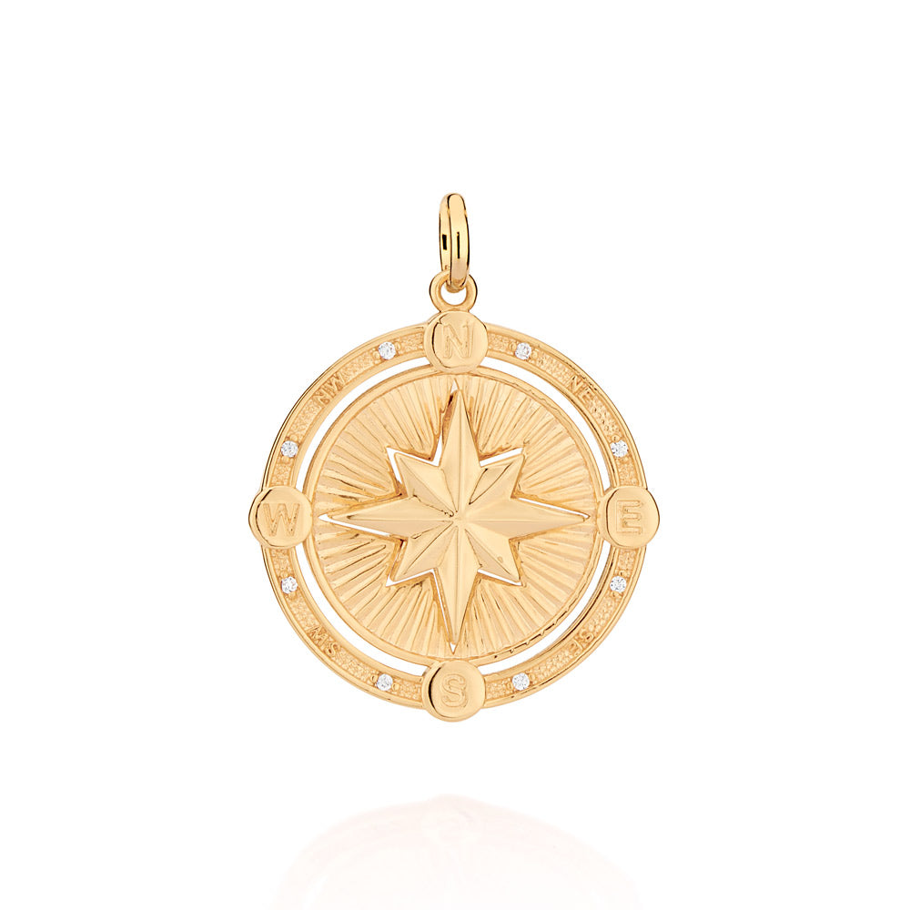 Gold plated 2 in 1 pendant in the shape of a compass studded by eight zirconias measuring 1.25mm each and a star at the center. size: 3.7cm x 3cm (1.46in x 1.18in)/ 1.8cm x 1.8cm (0.71in x 0.71in).