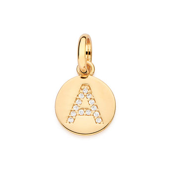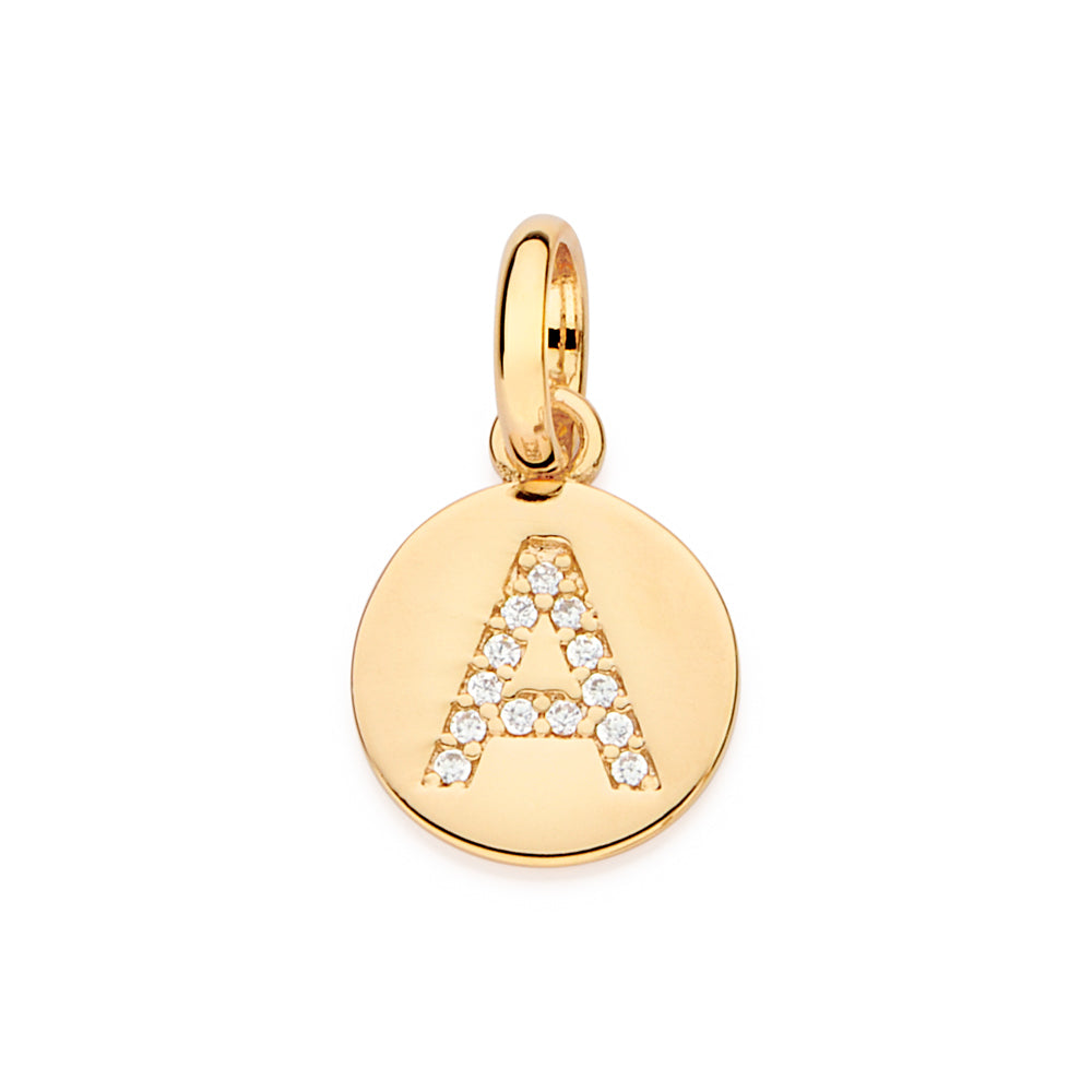 Gold plated circle pendant composed of a letter studded by 6 white zirconias measuring 1mm each (the number of zirconias can change depending on the letter). size: 1.3cm x 1.2cm (0.51in x 0.47in).