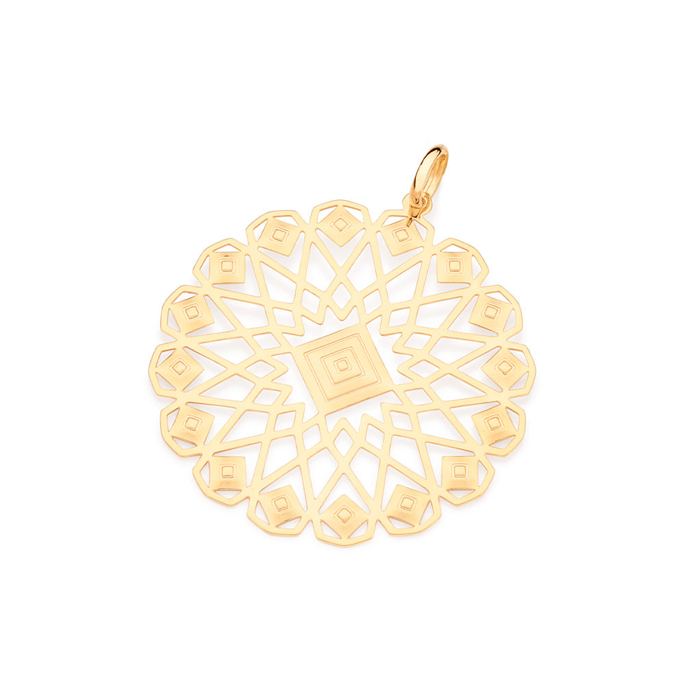 Gold plated pendant in the shape of a mandala with diamond shaped details. size: 4.8cm x 4.1cm (1.89in x 1.65in).