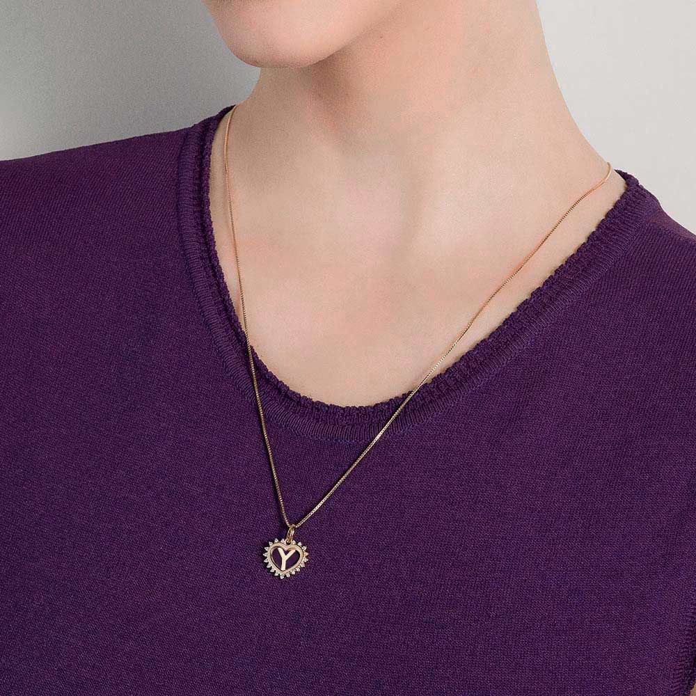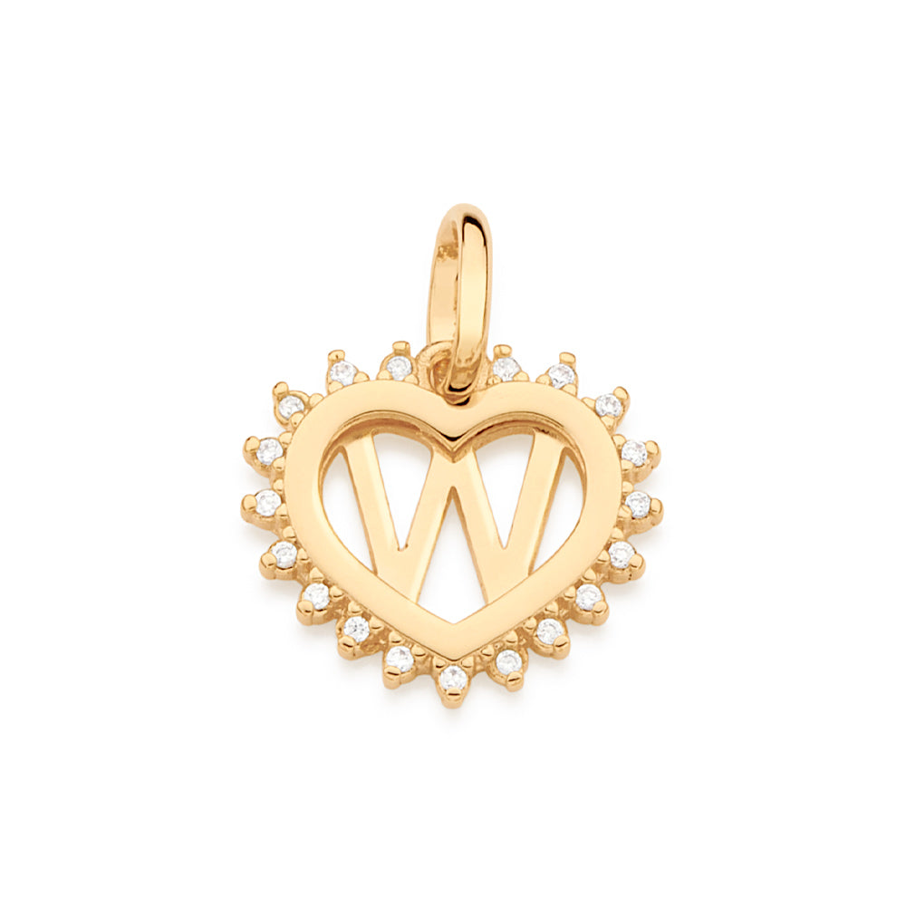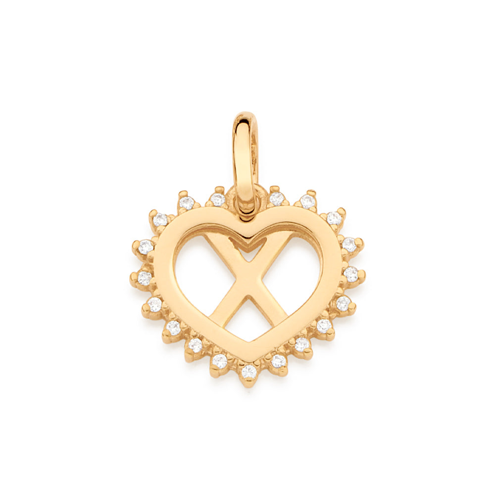 Gold plated pendant in the shape of a heart studded with nineteen (19) white zirconias measuring 1mm each with a letter at the center of the heart.