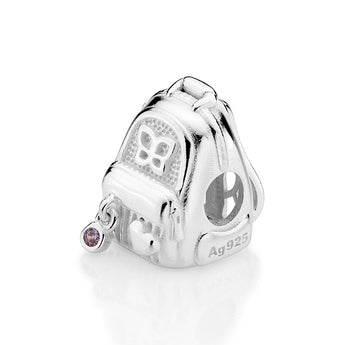 Silver 925 charm in the shape of a backpack studded by one (1) zirconia measuring 1.5mm. size: 1.5cm x 1.1cm (0.59in x 0.43in).