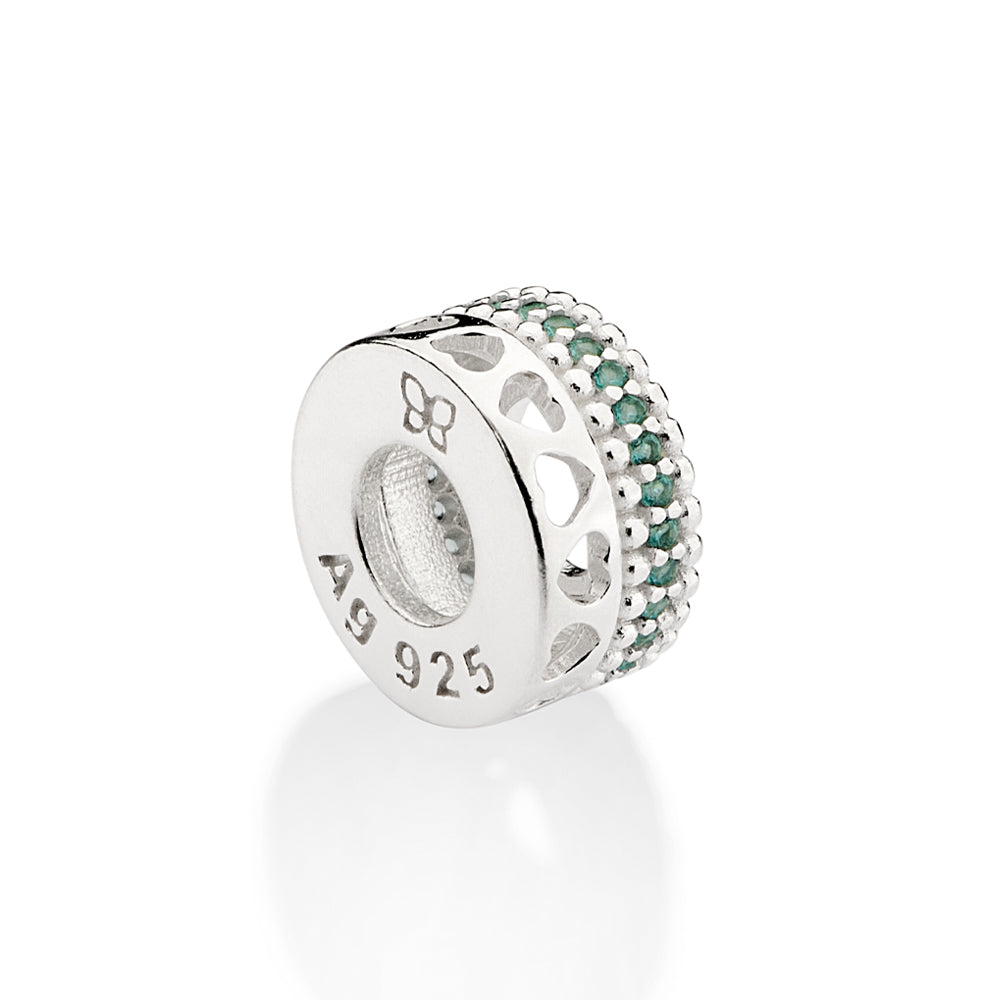 Silver 925 stopped charm studded by twenty-nine (29) white zirconias measuring 1mm each and hollow hearts. size: 1.1cm in diameter (0.43in in diameter).