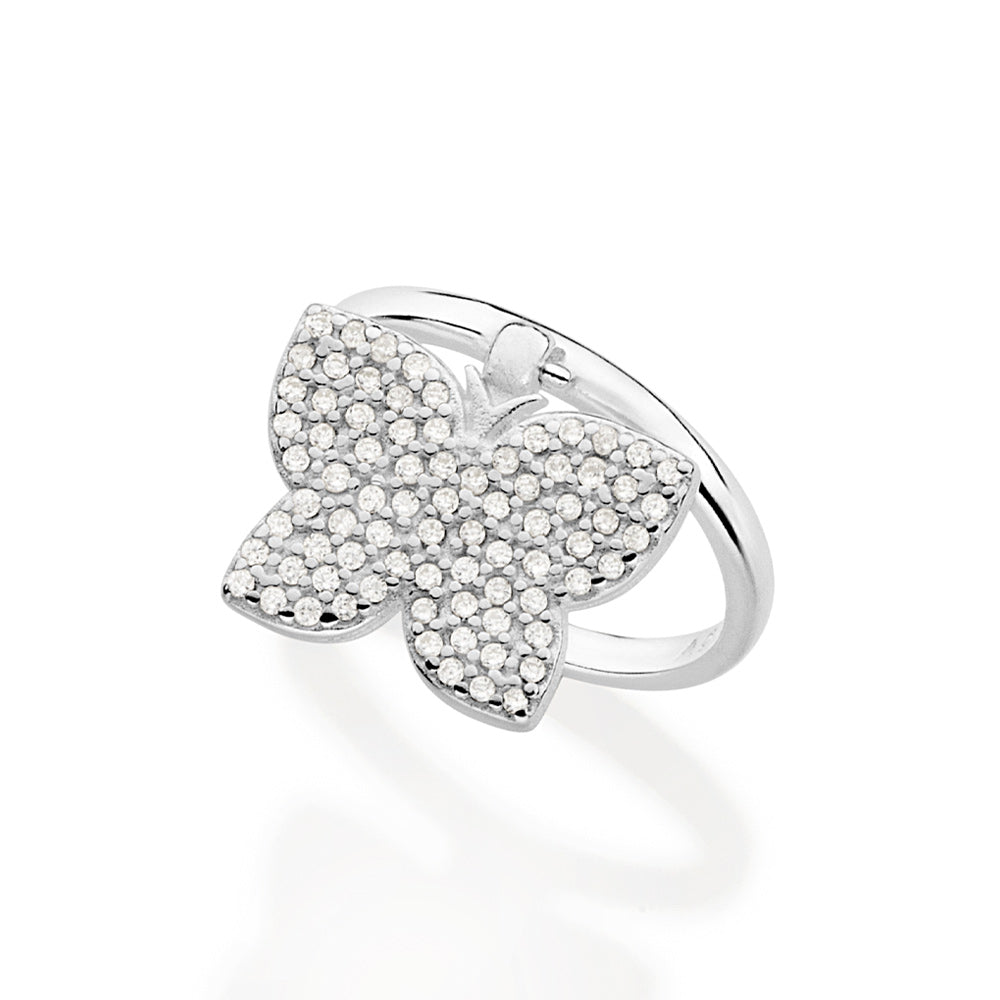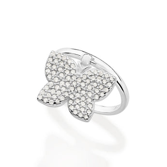 Silver 925 ring composed of a butterfly pendant hanging from the ring studded by seventy-eight (78) white zirconias measuring 1mm each.