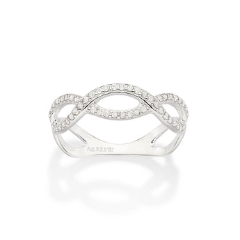 Silver 925 ring composed of infinity signs studded by fifty-two (52) zirconias measuring 1mm each.