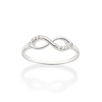 Silver 925 skinny ring composed of an infinity sign studded by eight (8) white zirconias measuring 1mm each.