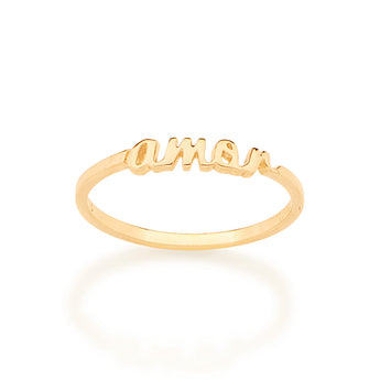 Rommanel's 2020 collection, colors of life, shows us that every color takes us to a special moment, memory, feeling, or experience in our life. by putting all those colors together, we have an amazing understanding and experience of life. in our collection's subcategoy, self love, we focused on creating stunning pieces that bring positive attitude, self confidence, and self love. gold plated skinny ring with the work amor (love) written on it in cursive. | material: 18k gold plated. (licensed jewelry collection 2020 - 1st cycle)"