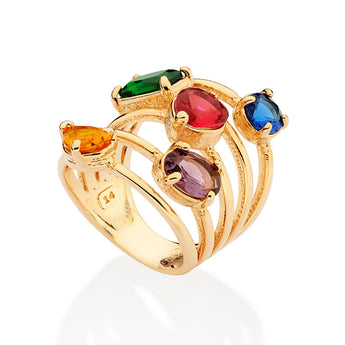 18k gold plated maxi ring composed of one (1) blue crystal measuring 5mm, one (1) green crystal measuring 7x5mm, one (1) red crystal in the shape of a heart measuring 6mm, one (1) purple crystal measuring 7x5mm and one (1) yellow crystal measuring 7x5mm each. size: 6 to 10 3/4. "
