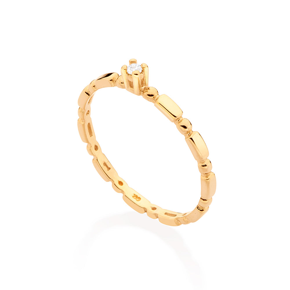 Gold plated engagement ring composed of a band make up of rectangles and spheres studded by 1 white zirconia measuring 1.75mm.