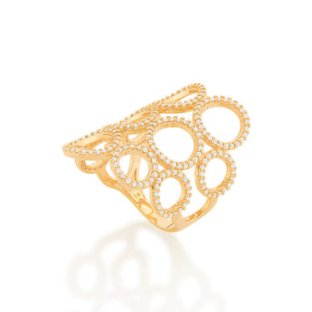 Rommanel presents the power to transform, an annual collection that reinforces your purpose and celebrates Rommanels 35th birthday. with jewelry that tells a story and translates Rommanels essence, the collection brings you pieces full of meaning. gold plated ring composed of multiple hollow circles studded with two hundred and twenty (220) white zirconias measuring 0.8mm each. | stone: zirconia. | material: 18k gold plated. "