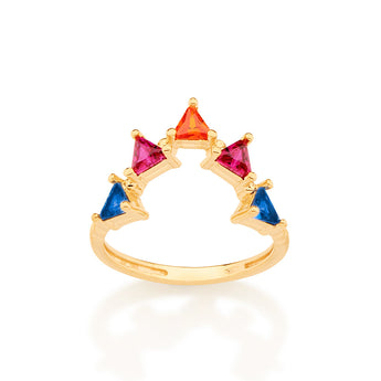 our newest collection signed by our muse, Ana hickmann, represents our love for our homeland, brazil. it represents the colors, flora and fauna found in our loved country. gold plated skinny ring composed of five triangle zirconias measuring 4x4mm each in blue, pink, and orange. | material: 18k gold plated. (licensed jewelry collection Ana hickmann 22st edition)"