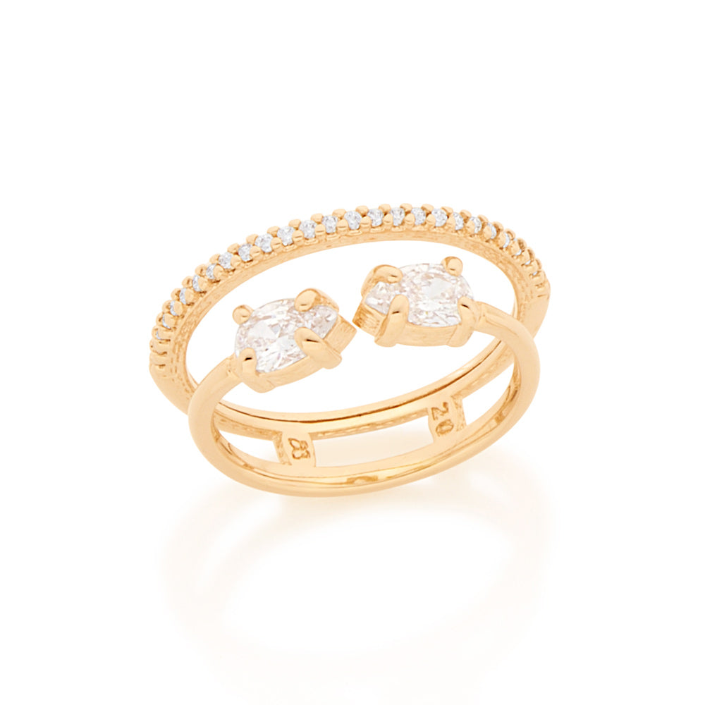 Rommanels permanent collection brings you traditional jewelry designs that are independent of current fashion trends and always in style. our Mothers day day capsule brings delicate and timeless pendants that represent the most pure and truthful emotion – the love between a mother and her child. gold plated ring featuring a double band – one band is composed of twenty-seven (27) white zirconias measuring 1mm each, while the second band features two (2) white zirconias in the shape of a water drop measuring 4x6mm each. if you are looking to give your mother a stunning gift this Mothers day day, look no further. | material: 18k gold plated. | also available in rhodium. "
