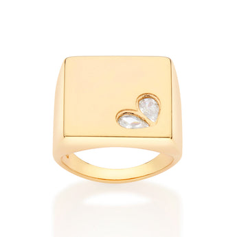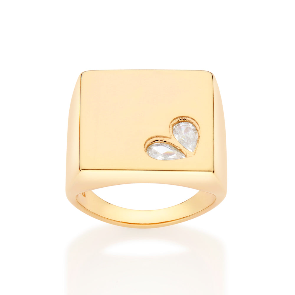 18k gold plated-plated square ring composed of a heart on the corner studded by two (2) white zirconias measuring 3x5mm each. exclusive of ana hickmann collection