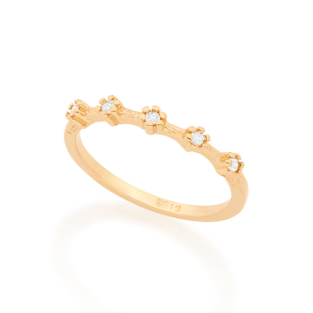 Rommanels permanent collection brings you traditional jewelry designs that are independent of current fashion trends. gold plated skinny ring composed of five (5) tiny flowers studded with one (1) white zirconia measuring 1.5mm at the center of each flower. skinny rings are the latest trend to create a layered look and this one is a must have in your collection! | material: 18k gold plated.