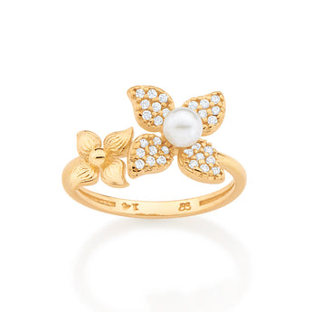Gold plated, ring composed of 1 flower studded with 32 white zirconias measuring 1mm each and 1 synthetic pearl measuring 4mm with 1 textured flower on the side. exclusive licensed jewelry of ""ana hickmann fashion jewelry"" collection"