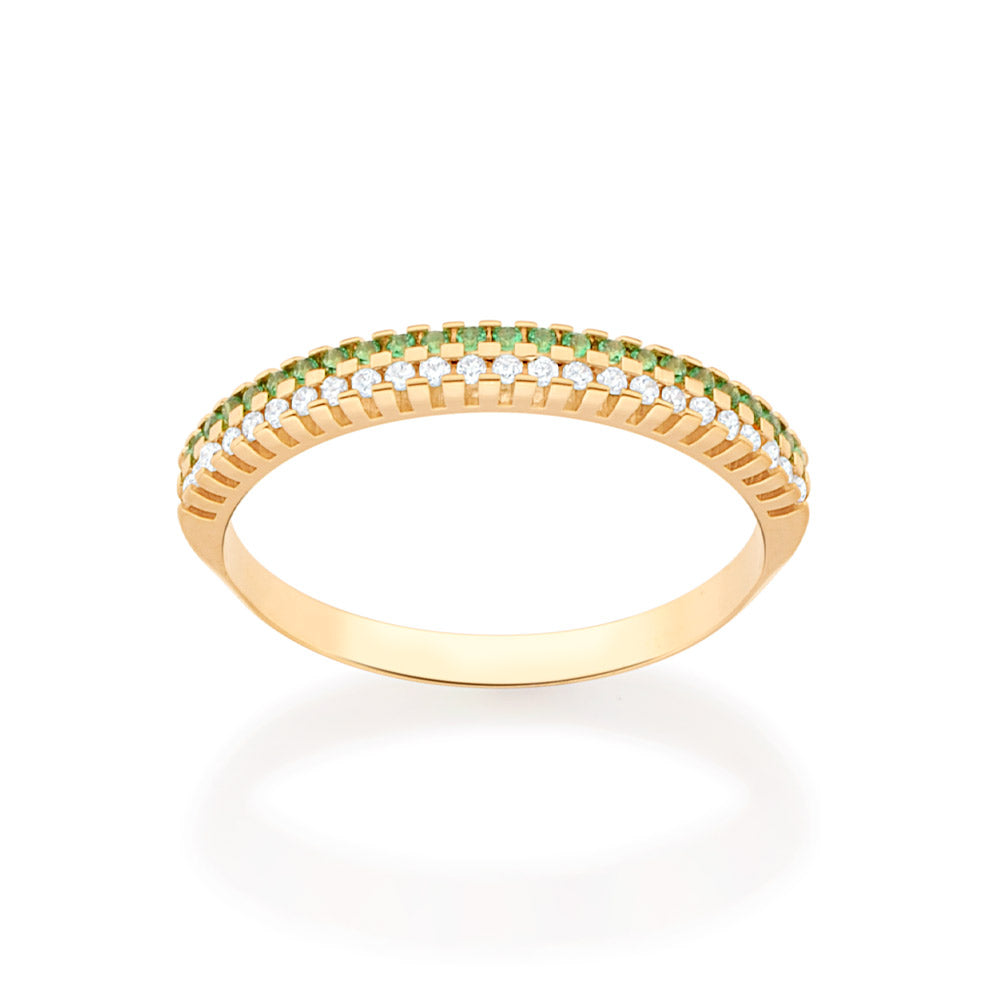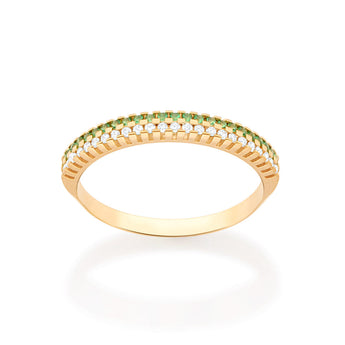 Gold plated skinny ring studded with 48 zirconias measuring 1mm each in green and white.