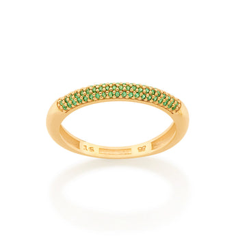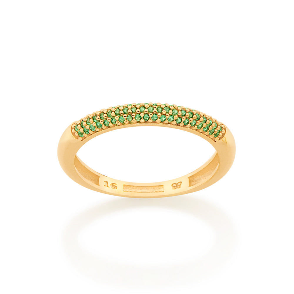 Rommanel presents the power to transform, an annual collection that reinforces your purpose and celebrates Rommanels 35th birthday. with jewelry that tells a story and translates Rommanels essence, the collection brings you pieces full of meaning. gold plated ring composed of a half studded band by sixty-one (61) green zirconias measuring 0.8mm each. | stone: zirconia. | material: 18k gold plated. "