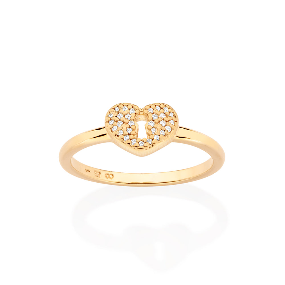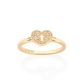 Gold plated skinny ring composed of a heart lock at the center studded by twenty-nine white zirconias measuring 0.8mm each.
